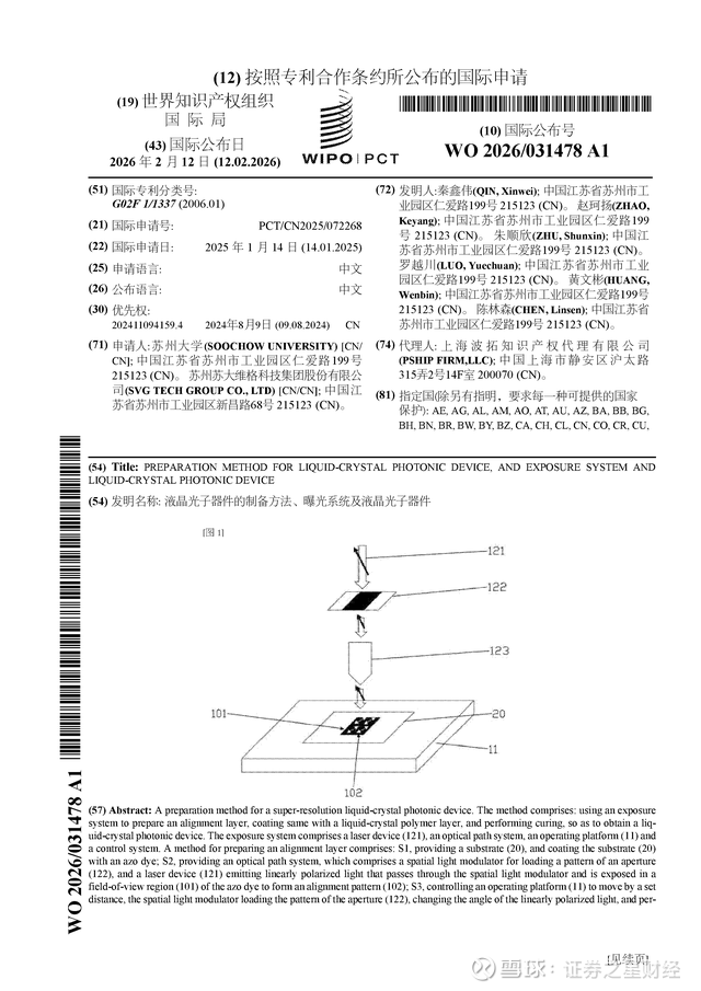 证券之星消息,根据企查查数据显示苏大维格(300331)公布了一项国际专利申请,专利名为“液晶光子器件的制备方法、曝光系统及液晶光子器件”,专利申请号为PCT/CN2025/072268,国际公布日为2026年2月12日。