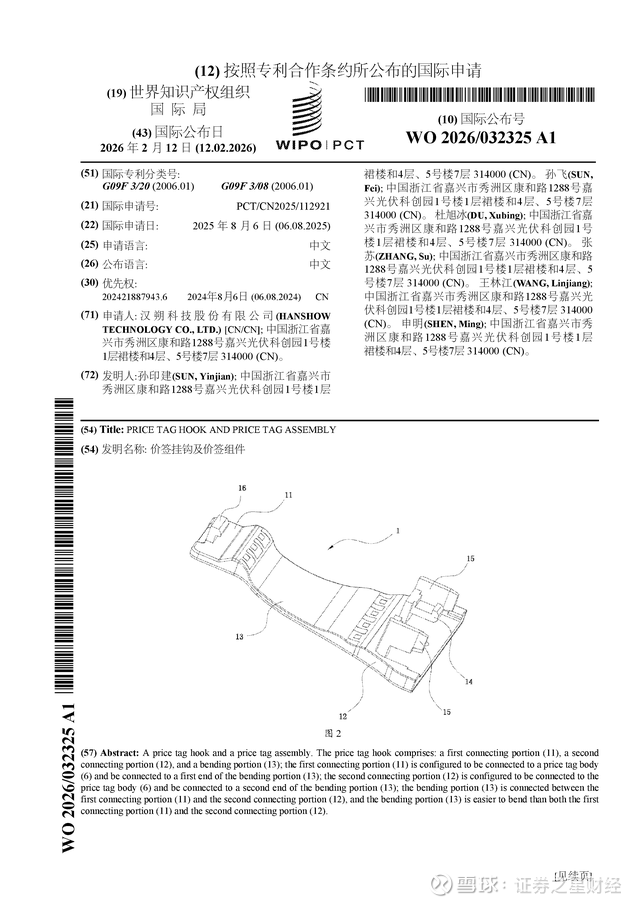 证券之星消息,根据企查查数据显示汉朔科技(301275)公布了一项国际专利申请,专利名为“价签挂钩及价签组件”,专利申请号为PCT/CN2025/112921,国际公布日为2026年2月12日。
