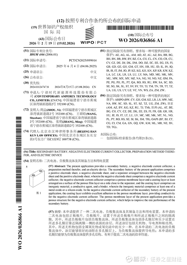证券之星消息,根据企查查数据显示宁德时代(300750)公布了一项国际专利申请,专利名为“二次电池、负极集流体及其制备方法和用电装置”,专利申请号为PCT/CN2025/099014,国际公布日为2026年2月19日。