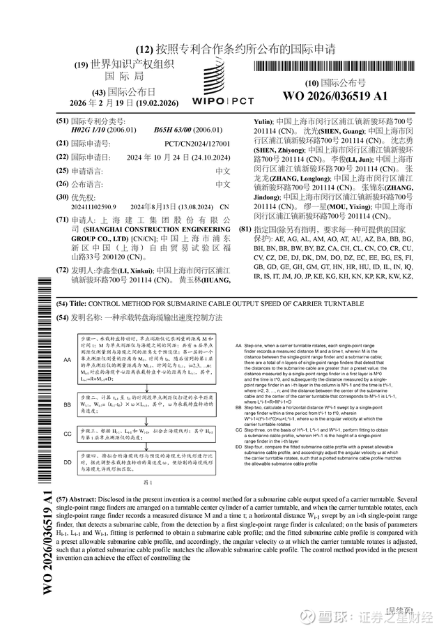证券之星消息,根据企查查数据显示上海建工(600170)公布了一项国际专利申请,专利名为“一种承载转盘海缆输出速度控制方法”,专利申请号为PCT/CN2024/127001,国际公布日为2026年2月19日。