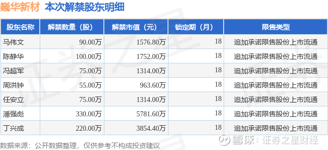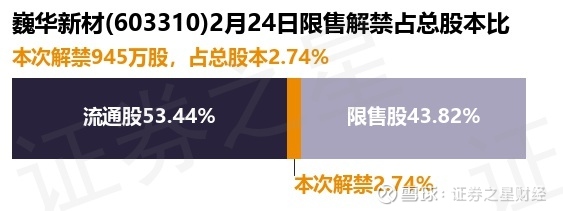 证券之星消息,根据市场公开信息整理,巍华新材(603310)于2月24日将有945.0万股限售股份解禁,为公司追加承诺限售股份上市流通,占公司总股本2.74%。(本次数据根据历史公告整理得出,实际情况以上市公司最新公告为准)最近一年内,该股累计解禁1.15亿股,占总股本的33.44%。本次解禁后,公司还有1.51亿股限售股份,占总股本43.82%。具体如下图所示: