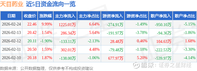 证券之星消息,天目药业2月24日涨停收盘,收盘价22.46元。该股于9点41分涨停,1次打开涨停,截止收盘封单资金为1019.91万元,占其流通市值0.37%。