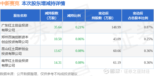 证券之星消息,2月24日中新赛克发布公告《中新赛克:关于股东减持计划时间届满的公告》,其股东广东红土创业投资有限公司、郑州百瑞创新资本创业投资有限公司、昆山红土高新创业投资有限公司、南京红土创业投资有限公司于2026年1月23日至2026年2月20日间合计减持74.12万股,占公司目前总股本的0.4341%,变动期间该股股价上涨2.18%,截止2月13日收盘报33.21元。