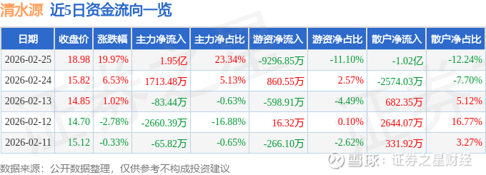 证券之星消息,清水源2月25日涨停收盘,收盘价18.98元。该股于9点52分涨停,未打开涨停,截止收盘封单资金为1.44亿元,占其流通市值4.32%。