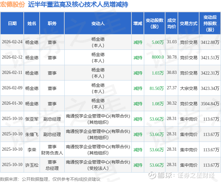 宏德股份近半年内的董监高及核心技术人员增减持详情如下: