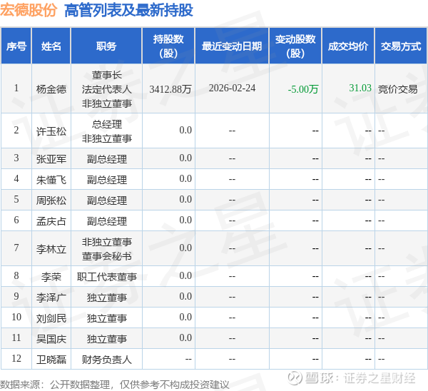 宏德股份的高管列表及最新持股情况如下:
