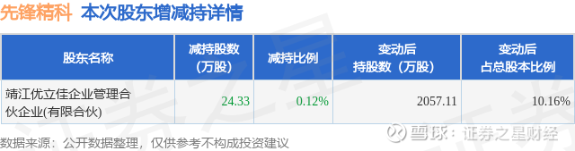 证券之星消息,2月26日先锋精科发布公告《先锋精科:先锋精科关于持股5%以上股东提前终止减持计划暨减持股份结果公告》,其股东靖江优立佳企业管理合伙企业(有限合伙)于2026年2月26日合计减持24.33万股,占公司目前总股本的0.1202%,变动期间该股股价上涨1.14%,截止2月26日收盘报70.17元。