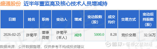 证券之星消息,根据2月26日市场公开信息、上市公司公告及交易所披露数据整理,盛通股份(002599)最新董监高及相关人员股份变动情况:2026年2月25日公司董事,高管许菊平共减持公司股份5000.0股,占公司总股本为0.0009%。变动期间公司股价下跌0.36%,2月25日当日收盘报8.28元。