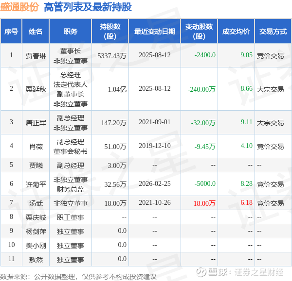 盛通股份的高管列表及最新持股情况如下: