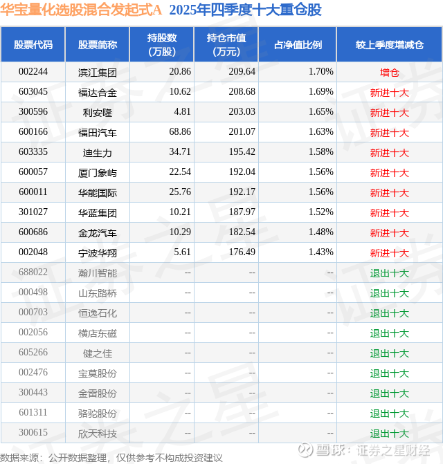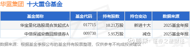 根据2025基金年报公募基金重仓股数据,重仓该股的公募基金共2家,其中持有数量最多的公募基金为华宝基金的华宝量化选股混合发起式A。华宝量化选股混合发起式A目前规模为0.26亿元,最新净值1.5724(2月26日),较上一交易日下跌0.01%,近一年上涨40.76%。该公募基金现任基金经理为徐林明 喻银尤。徐林明在任的基金产品包括:华宝量化对冲混合A,管理时间为2014年9月17日至今,期间收益率为44.75%;华宝沪深300增强策略ETF发起式联接A,管理时间为2016年12月9日至今,期间收益率为108.01%;华宝中证A500指数增强A,管理时间为2025年6月4日至今,期间收益率为30.45%。喻银尤在任的基金产品包括:华宝新活力混合C,管理时间为2025年3月29日至今,期间收益率为33.66%;华宝中证A500指数增强A,管理时间为2025年6月4日至今,期间收益率为30.45%;华宝上证科创板综合指数增强A,管理时间为2025年9月16日至今,期间收益率为14.13%。