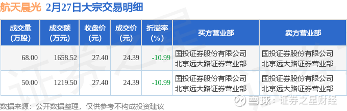 证券之星消息,2月27日航天晨光发生大宗交易,交易数据如下: