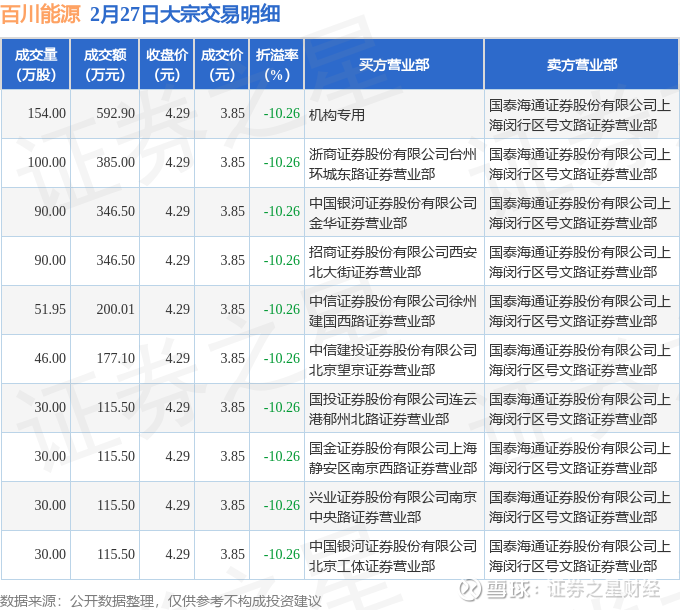 证券之星消息,2月27日百川能源发生大宗交易,交易数据如下: