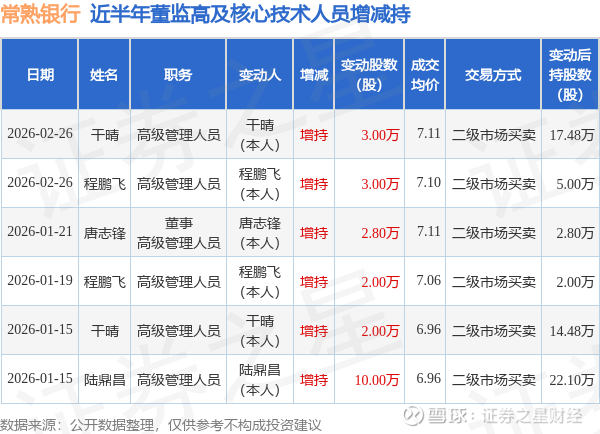 证券之星消息,根据2月27日市场公开信息、上市公司公告及交易所披露数据整理,常熟银行(601128)最新董监高及相关人员股份变动情况:2026年2月26日公司高级管理人员干晴、高级管理人员程鹏飞共增持公司股份6.0万股,占公司总股本为0.0018%。变动期间公司股价上涨0.0%,2月26日当日收盘报7.12元。