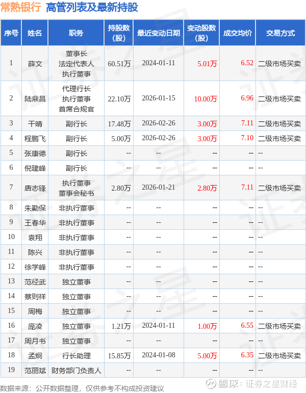 常熟银行近半年内的董监高及核心技术人员增减持详情如下: