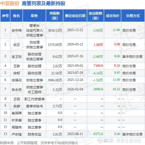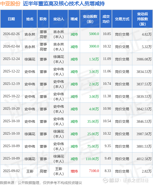 中亚股份近半年内的董监高及核心技术人员增减持详情如下: