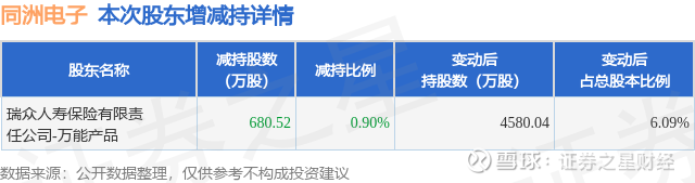 证券之星消息,2月27日同洲电子发布公告《同洲电子:关于持股5%以上股东减持计划实施完成的公告》,其股东瑞众人寿保险有限责任公司-万能产品于2026年1月31日至2026年2月26日间合计减持680.52万股,占公司目前总股本的0.9044%,变动期间该股股价上涨4.91%,截止2月26日收盘报12.4元。