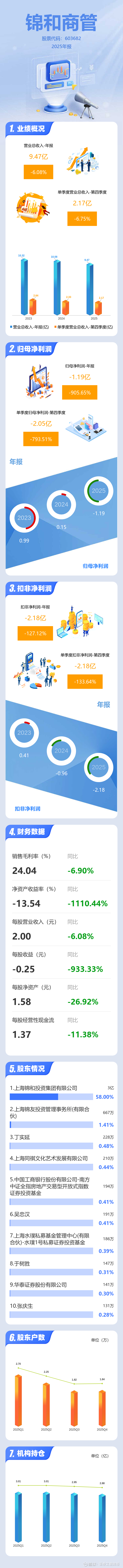 证券之星消息,锦和商管2025年年报显示,当年度公司主营收入9.47亿元,同比下降6.09%;归母净利润-1.19亿元,同比下降905.66%;扣非净利润-2.18亿元,同比下降127.13%;其中2025年第四季度,公司单季度主营收入2.17亿元,同比下降6.75%;单季度归母净利润-2.05亿元,同比下降793.52%;单季度扣非净利润-2.18亿元,同比下降133.65%;负债率84.1%,投资收益113.67万元,财务费用1.6亿元,毛利率24.04%。