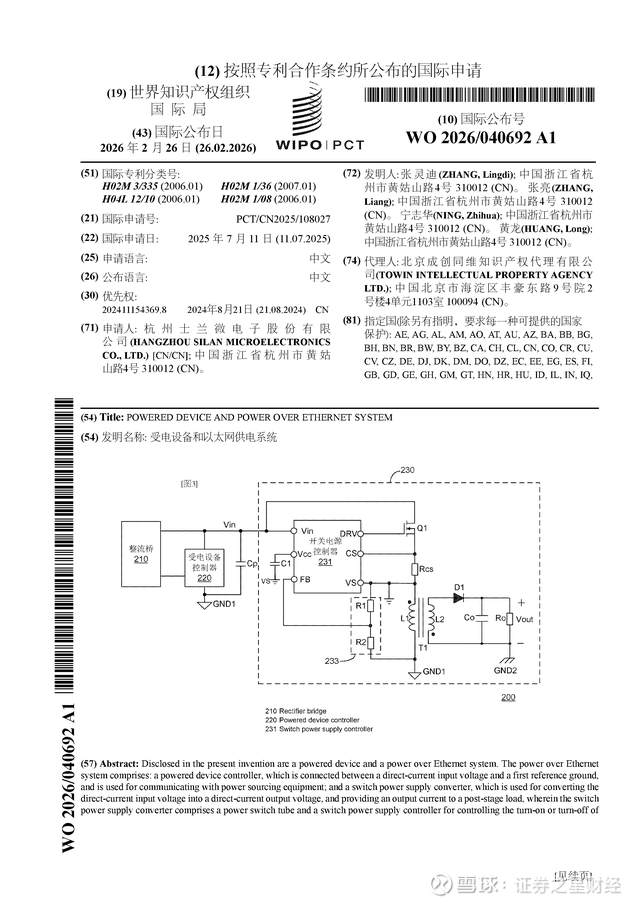 证券之星消息,根据企查查数据显示士兰微(600460)公布了一项国际专利申请,专利名为“受电设备和以太网供电系统”,专利申请号为PCT/CN2025/108027,国际公布日为2026年2月26日。