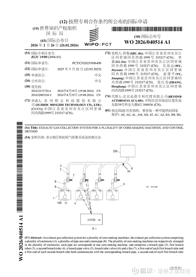 证券之星消息,根据企查查数据显示明志科技(688355)公布了一项国际专利申请,专利名为“多台制芯机的尾气收集系统及控制方法”,专利申请号为PCT/CN2025/096490,国际公布日为2026年2月26日。