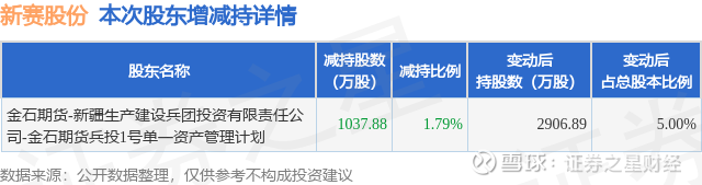 证券之星消息,3月1日新赛股份发布公告《新赛股份:新疆赛里木现代农业股份有限公司简式权益变动报告书》,其股东金石期货-新疆生产建设兵团投资有限责任公司-金石期货兵投1号单一资产管理计划于2026年2月27日合计减持1037.88万股,占公司目前总股本的1.7852%,变动期间该股股价下跌5.78%,截止2月27日收盘报5.38元。