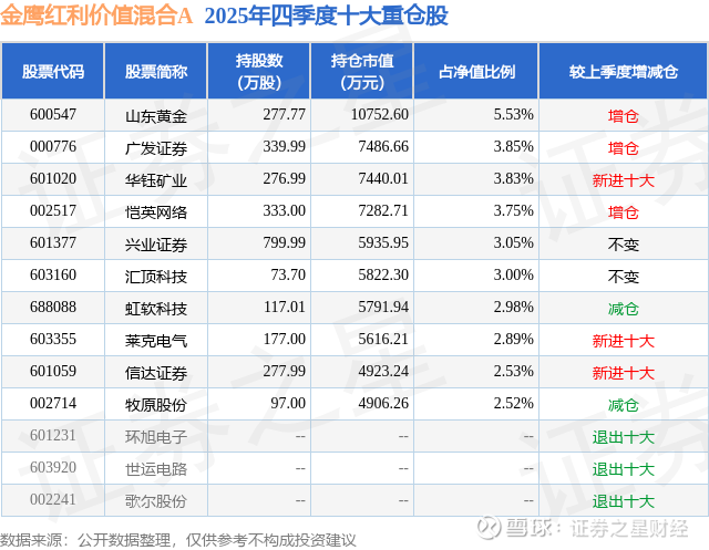 根据2025基金年报公募基金重仓股数据,重仓该股的公募基金共4家,其中持有数量最多的公募基金为金鹰基金的金鹰红利价值混合A。金鹰红利价值混合A目前规模为14.29亿元,最新净值2.6419(2月27日),较上一交易日上涨1.32%,近一年上涨16.78%。该公募基金现任基金经理为陈颖。陈颖在任的基金产品包括:金鹰核心资源混合A,管理时间为2019年1月26日至今,期间收益率为285.9%;金鹰科技创新股票A,管理时间为2021年5月18日至今,期间收益率为145.84%;金鹰科技致远混合A,管理时间为2024年3月19日至今,期间收益率为101.94%。