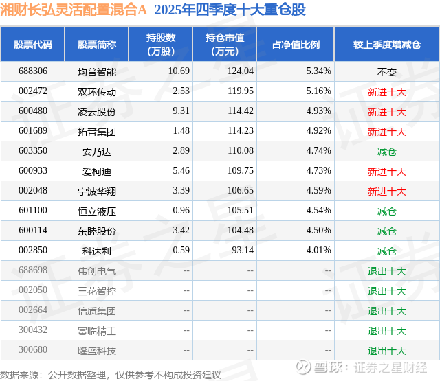 湘财长弘灵活配置混合A的前十大重仓股如下: