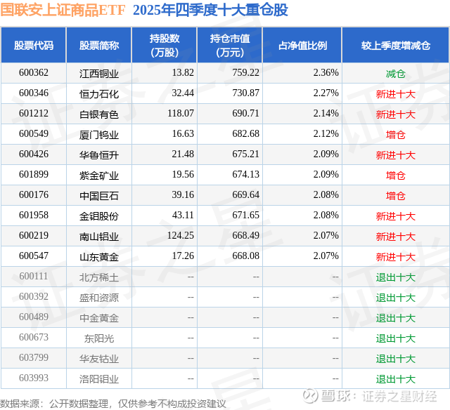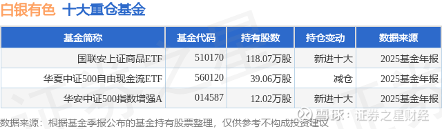 根据2025基金年报公募基金重仓股数据,重仓该股的公募基金共3家,其中持有数量最多的公募基金为国联安基金的国联安上证商品ETF。国联安上证商品ETF目前规模为3.22亿元,最新净值1.582(2月27日),较上一交易日上涨2.86%,近一年上涨85.25%。该公募基金现任基金经理为黄欣。黄欣在任的基金产品包括:国联安中证A100指数(LOF),管理时间为2010年4月16日至今,期间收益率为131.96%;国联安上证商品ETF联接A,管理时间为2010年12月1日至今,期间收益率为89.15%;国联安中证医药100A,管理时间为2016年8月19日至今,期间收益率为-1.54%。