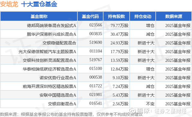 根据2025基金年报公募基金重仓股数据,重仓该股的公募基金共19家,其中持有数量最多的公募基金为德邦基金的德邦高端装备混合发起式A。德邦高端装备混合发起式A目前规模为0.61亿元,最新净值1.2149(2月27日),较上一交易日下跌1.36%。该公募基金现任基金经理为陆阳。陆阳在任的基金产品包括:德邦稳盈增长灵活配置混合A,管理时间为2023年10月25日至今,期间收益率为41.4%;德邦鑫星价值灵活配置混合A,管理时间为2024年1月30日至今,期间收益率为344.25%;