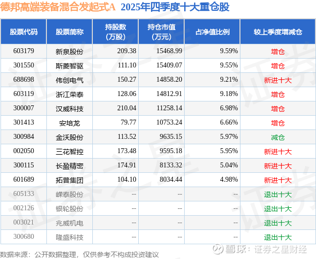 德邦高端装备混合发起式A的前十大重仓股如下: