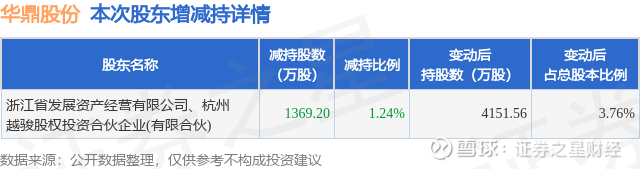 证券之星消息,3月2日华鼎股份发布公告《华鼎股份:义乌华鼎锦纶股份有限公司股东减持股份结果公告》,其股东浙江省发展资产经营有限公司、杭州越骏股权投资合伙企业(有限合伙)于2026年1月7日至2026年3月2日间合计减持1369.2万股,占公司目前总股本的1.24%,变动期间该股股价下跌0.62%,截止3月2日收盘报4.81元。