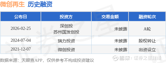 证券之星消息,根据天眼查APP于2月25日公布的信息整理,苏州微创再生医学科技有限公司A轮融资,融资额未披露,参与投资的机构包括深创投,苏州国发创投。