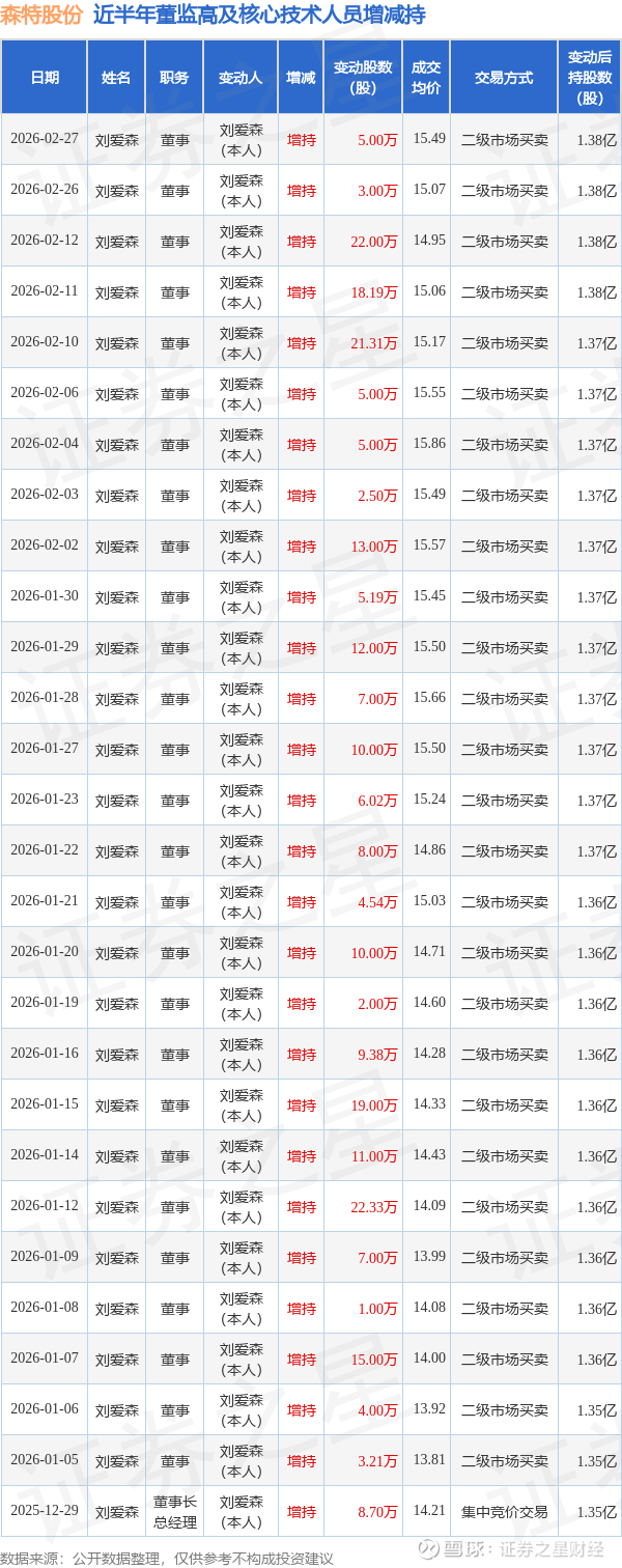 证券之星消息,根据3月2日市场公开信息、上市公司公告及交易所披露数据整理,森特股份(603098)最新董监高及相关人员股份变动情况:2026年2月27日公司董事刘爱森共增持公司股份5.0万股,占公司总股本为0.0093%。变动期间公司股价上涨2.1%,2月27日当日收盘报15.55元。