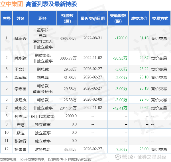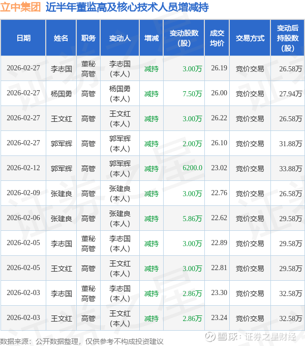 立中集团近半年内的董监高及核心技术人员增减持详情如下: