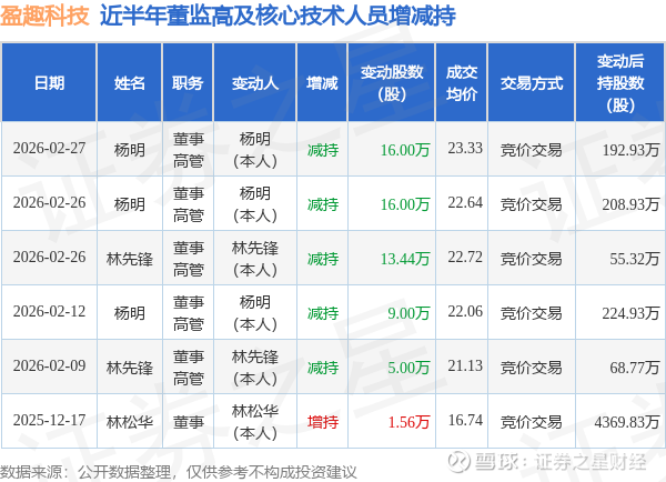 盈趣科技近半年内的董监高及核心技术人员增减持详情如下: