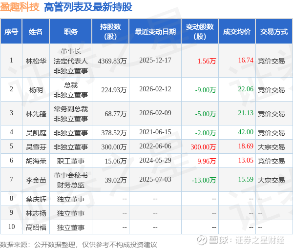 盈趣科技的高管列表及最新持股情况如下: