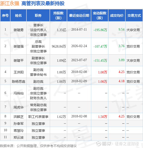 证券之星消息,根据3月2日市场公开信息、上市公司公告及交易所披露数据整理,浙江永强(002489)最新董监高及相关人员股份变动情况:2026年2月27日公司董事,高管谢建强共减持公司股份50.0万股,占公司总股本为0.0231%。变动期间公司股价上涨0.27%,2月27日当日收盘报3.7元。