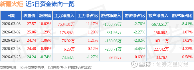 证券之星消息,新疆火炬3月3日涨停收盘,收盘价27.57元。该股于13点14分涨停,1次打开涨停,截止收盘封单资金为425.13万元,占其流通市值0.11%。