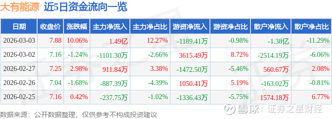 证券之星消息,大有能源3月3日涨停收盘,收盘价7.88元。该股于13点24分涨停,1次打开涨停,截止收盘封单资金为1005.57万元,占其流通市值0.05%。