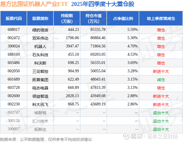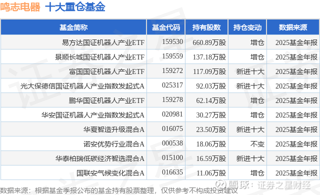 根据2025基金年报公募基金重仓股数据,重仓该股的公募基金共15家,其中持有数量最多的公募基金为易方达基金的易方达国证机器人产业ETF。易方达国证机器人产业ETF目前规模为152.67亿元,最新净值1.5315(3月2日),较上一交易日下跌2.64%,近一年上涨10.71%。该公募基金现任基金经理为李栩 李树建。李栩在任的基金产品包括:易方达中证港股通互联网ETF,管理时间为2023年5月31日至今,期间收益率为27.67%;易方达中证2000ETF,管理时间为2023年9月13日至今,期间收益率为78.63%;易方达中证生物科技主题ETF发起式联接A,管理时间为2023年9月19日至今,期间收益率为-4.6%;易方达国证信息技术创新主题ETF,管理时间为2023年9月20日至今,期间收益率为81.91%。李树建在任的基金产品包括:易方达机器人ETF联接A,管理时间为2024年5月21日至今,期间收益率为52.4%;易方达中证沪深港黄金产业股票指数发起式A,管理时间为2024年10月29日至今,期间收益率为118.4%;易方达国证价值100ETF,管理时间为2025年6月30日至今,期间收益率为20.41%。