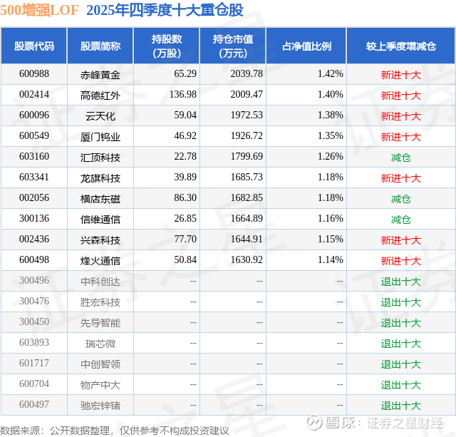 根据2025基金年报公募基金重仓股数据,重仓该股的公募基金共2家,其中持有数量最多的公募基金为西部利得基金的500增强LOF。500增强LOF目前规模为11.36亿元,最新净值2.2288(3月2日),较上一交易日上涨0.25%,近一年上涨46.78%。该公募基金现任基金经理为盛丰衍。盛丰衍在任的基金产品包括:西部利得沪深300指数增强A,管理时间为2018年1月26日至今,期间收益率为86.89%;西部利得国企红利指数增强A,管理时间为2018年7月11日至今,期间收益率为151.43%;西部利得量化成长混合A,管理时间为2019年3月19日至今,期间收益率为247.89%。