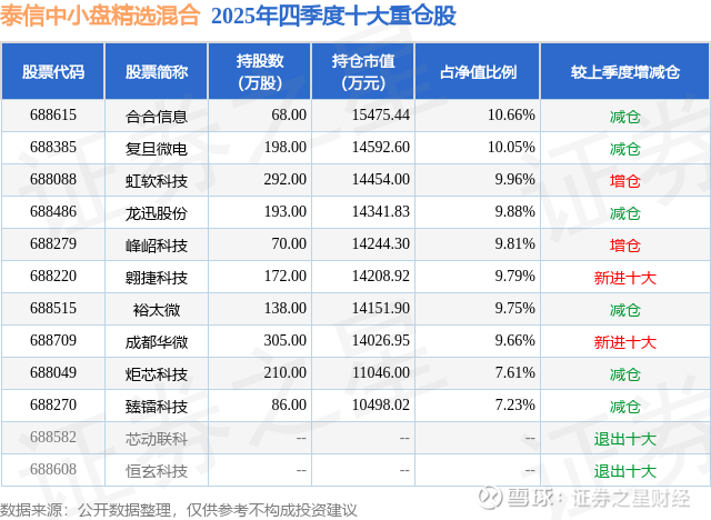 根据2025基金年报公募基金重仓股数据,重仓该股的公募基金共3家,其中持有数量最多的公募基金为泰信基金的泰信中小盘精选混合。泰信中小盘精选混合目前规模为14.52亿元,最新净值4.949(3月2日),较上一交易日下跌2.04%,近一年上涨25.58%。该公募基金现任基金经理为董季周。董季周在任的基金产品包括:泰信鑫选灵活配置混合A,管理时间为2020年11月24日至今,期间收益率为25.58%。