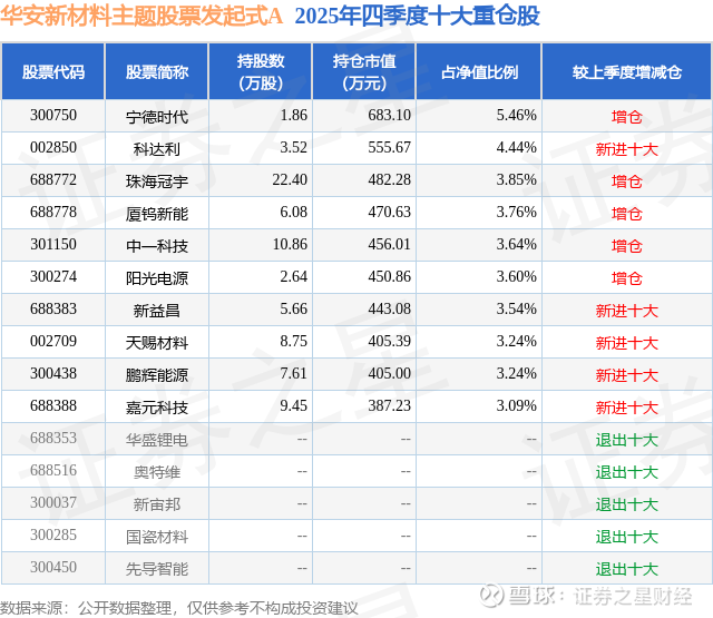 华安新材料主题股票发起式A的前十大重仓股如下: