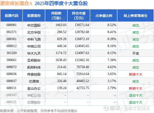 根据2025基金年报公募基金重仓股数据,重仓该股的公募基金共160家,其中持有数量最多的公募基金为诺安基金的诺安成长混合A。诺安成长混合A目前规模为141.02亿元,最新净值2.01(3月2日),较上一交易日下跌1.66%,近一年上涨35.54%。该公募基金现任基金经理为刘慧影。刘慧影在任的基金产品包括:诺安优化配置混合A,管理时间为2022年8月3日至今,期间收益率为89.55%;诺安积极回报混合A,管理时间为2023年9月29日至今,期间收益率为27.4%。