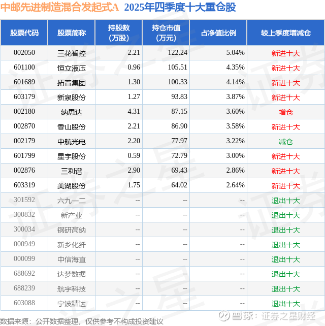 根据2025基金年报公募基金重仓股数据,重仓该股的公募基金共2家,其中持有数量最多的公募基金为中邮基金的中邮先进制造混合发起式A。中邮先进制造混合发起式A目前规模为0.16亿元,最新净值1.0264(3月2日),较上一交易日下跌2.58%。该公募基金现任基金经理为沈路遥。