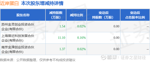 证券之星消息,3月3日近岸蛋白发布公告《近岸蛋白:股东减持股份结果公告》,其股东苏州金灵创业投资合伙企业(有限合伙)、上海普近科技发展合伙企业(有限合伙)、南京金溧创业投资合伙企业(有限合伙)于2025年12月4日至2026年3月3日间合计减持14.01万股,占公司目前总股本的0.1997%,变动期间该股股价上涨2.02%,截止3月3日收盘报41.36元。