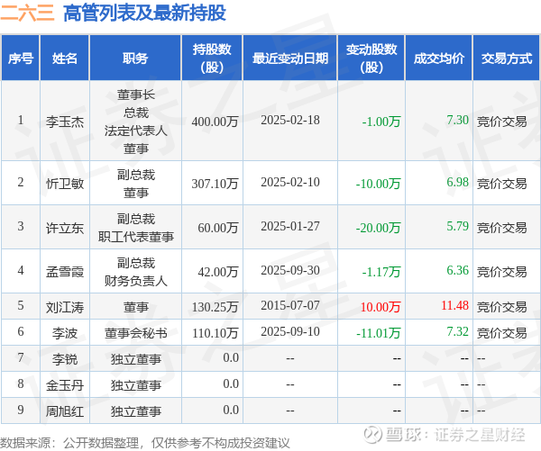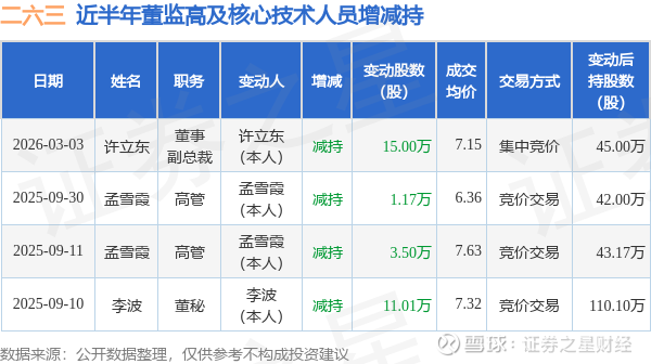 证券之星消息,根据3月3日市场公开信息、上市公司公告及交易所披露数据整理,二六三(002467)最新董监高及相关人员股份变动情况:2026年3月3日公司董事,副总裁许立东共减持公司股份15.0万股,占公司总股本为0.0109%。变动期间公司股价下跌9.99%,3月3日当日收盘报6.49元。