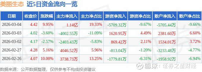 证券之星消息,美丽生态3月4日涨停收盘,收盘价4.42元。该股于10点10分涨停,5次打开涨停,截止收盘封单资金为3642.38万元,占其流通市值0.97%。