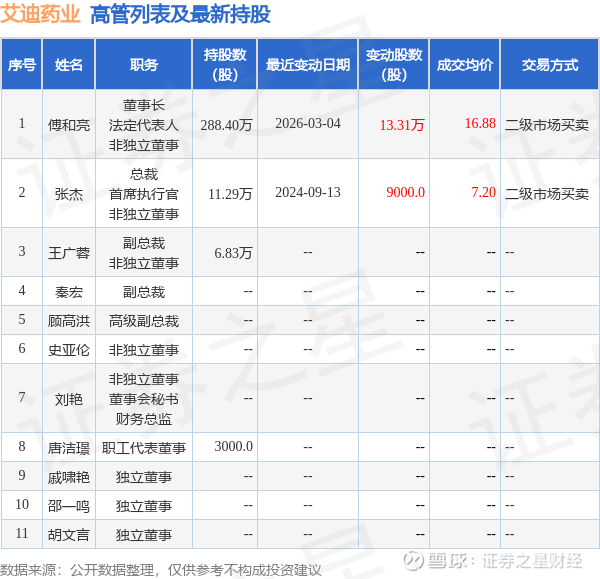 证券之星消息,根据3月4日市场公开信息、上市公司公告及交易所披露数据整理,艾迪药业(688488)最新董监高及相关人员股份变动情况:2026年3月4日公司董事,核心技术人员傅和亮共增持公司股份13.31万股,占公司总股本为0.0316%。变动期间公司股价上涨2.6%,3月4日当日收盘报17.0元。