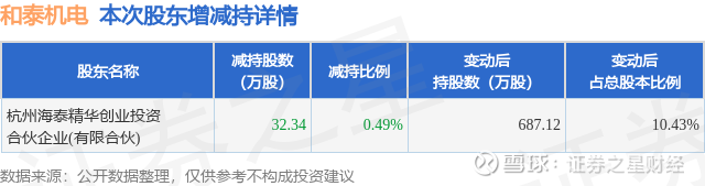 证券之星消息,3月4日和泰机电发布公告《和泰机电:关于持股5%以上股东减持计划期限届满暨实施情况的公告》,其股东杭州海泰精华创业投资合伙企业(有限合伙)于2026年1月6日至2026年2月10日间合计减持32.34万股,占公司目前总股本的0.4909%,变动期间该股股价上涨26.09%,截止2月10日收盘报79.3元。
