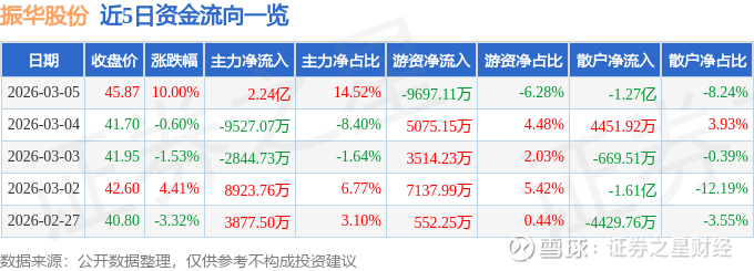证券之星消息,振华股份3月5日涨停收盘,收盘价45.87元。该股于13点40分涨停,2次打开涨停,截止收盘封单资金为4782.86万元,占其流通市值0.15%。